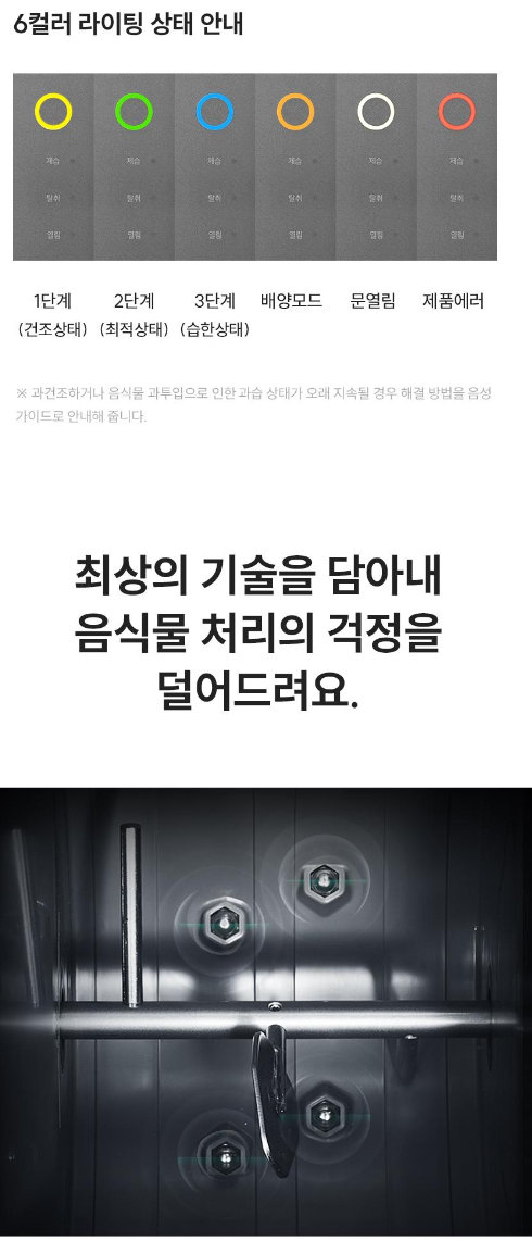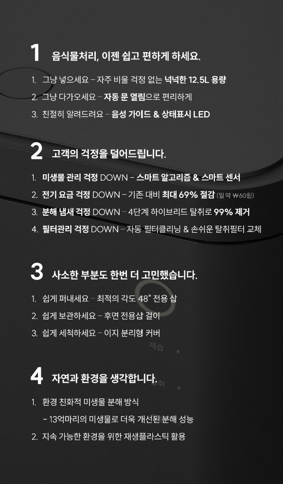 – 미생물 발효 방식으로 음식물 잔여물을 건조·분해하는 구조로 되어 있어 습기 및 냄새 발생 위험을 줄여줍니다.