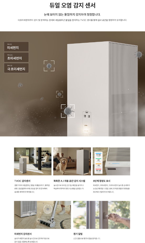 실시간으로 미세먼지를 감지하고, 모드 전환 없이도 쾌적한 상태 유지