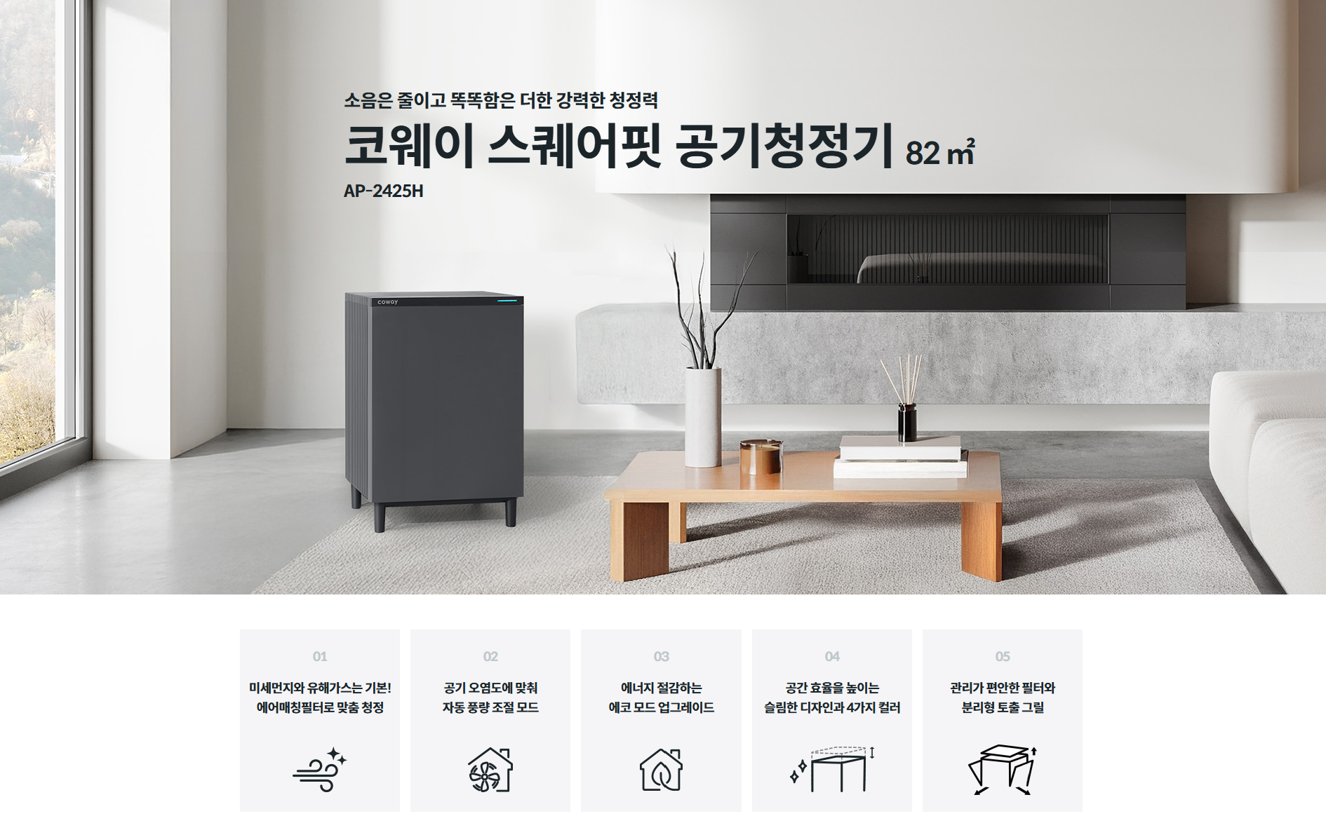 오늘은 ‘넓은 공간’에서도 강력한 청정 기능을 갖춘 코웨이 스퀘어핏 공기청정기 AP‑2425H 를 소개드립니다.