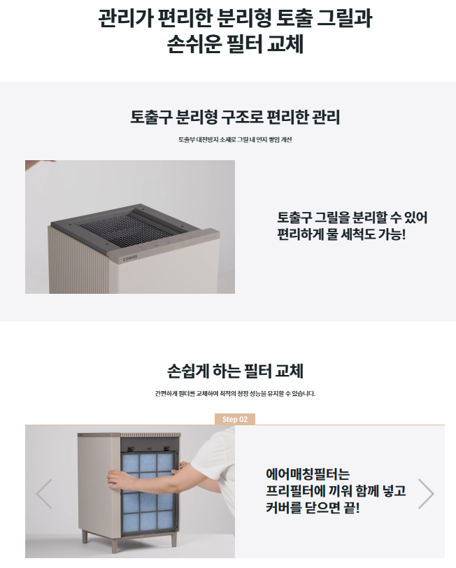 공기청정기의 가장 큰 고민 중 하나는 필터 청소 및 관리주기 와 본체 내부 위생 상태 인데요. 이 모델은 그 점에서도 꽤 신경 썼습니다.