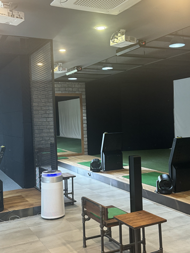 저희 골프장은 약 100평 규모의 오픈타석 구조로, 벽이 없는 개방형 타석이 6개 있습니다. 이런 구조에서는 일반 가정용 공기청정기로는 역부족이고, 넓은 공간을 한 번에 커버할 수 있는 고성능 모델이 필수입니다.