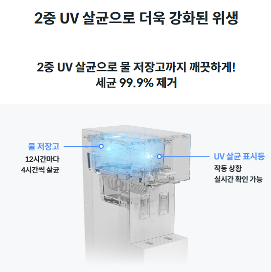 ✅전·후면 2중 UV 모듈 탑재로 내부 물 저장고를 주기적으로 살균(제품 기준: 일정 주기 자동 살균 동작)해 내부 위생을 높였습니다.