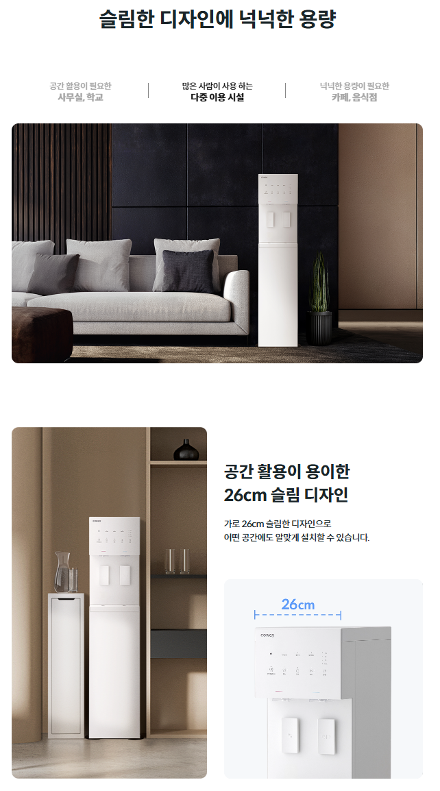 ✅좁은 주방·한켠에 설치할 정수기를 찾는 분 — 26cm 슬림 폭이라 설치 공간 부담 적음.