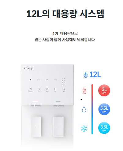 ✅총 12L 풍부한 물 저장 용량(정수 5.5L / 냉수 3.5L / 온수 3.0L) — 물 사용량이 많은 장소에서도 안정적으로 사용 가능합니다.